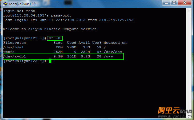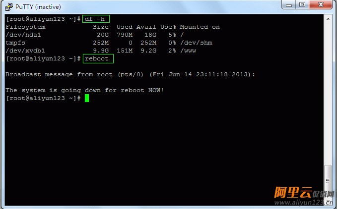 7.查看磁盘状态,用df -h,没问题后,运行reboot,重启一下服务器!